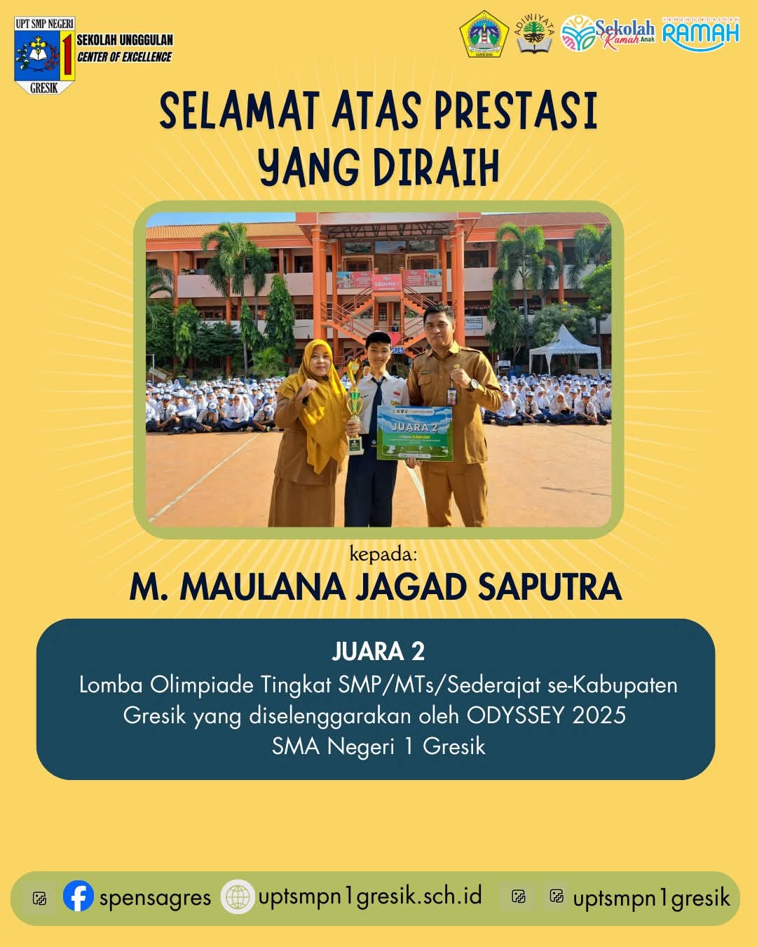 GRESIK, BN News – Selamat atas prestasi yang diraih oleh Peserta Didik UPT SMP NEGERI 1 GRESIK, khususnya kepada M. MAULANA JAGAD SAPUTRA (kelas 8C) peraih JUARA 2 dalam dalam Lomba Olimpiade seluruh mata pelajaran Tingkat SMP/MTs/Sederajat se-Kabupaten Gresik yang diselenggarakan oleh ODYSSEY 2025 SMA Negeri 1 Gresik.