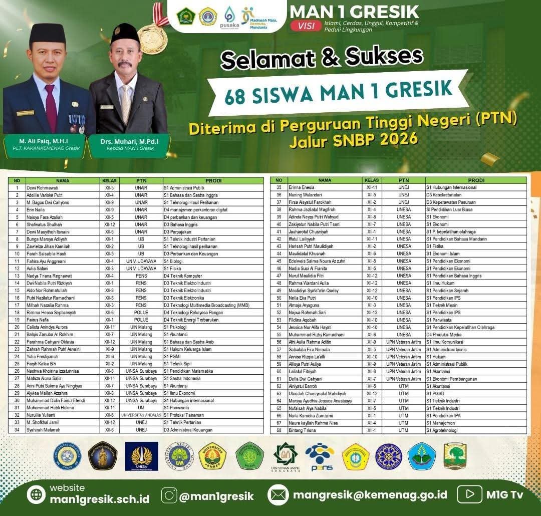 Pada tahun 2026 ini, sebanyak 68 siswa terbaik MAN 1 Gresik dinyatakan lolos melalui jalur Seleksi Nasional Berdasarkan Prestasi (SNBP) ke berbagai universitas ternama di Indonesia.