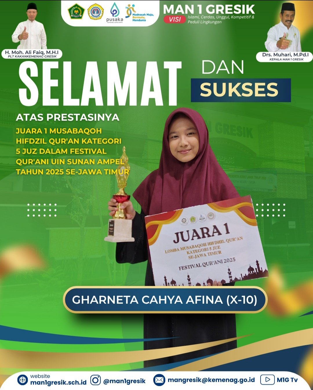 Kepala MAN 1 Gresik Drs. H. Muhari, M.Pd.I. mengucapkan syukur dan memberikan apresiasi kepada Gharneta Cahya Afina