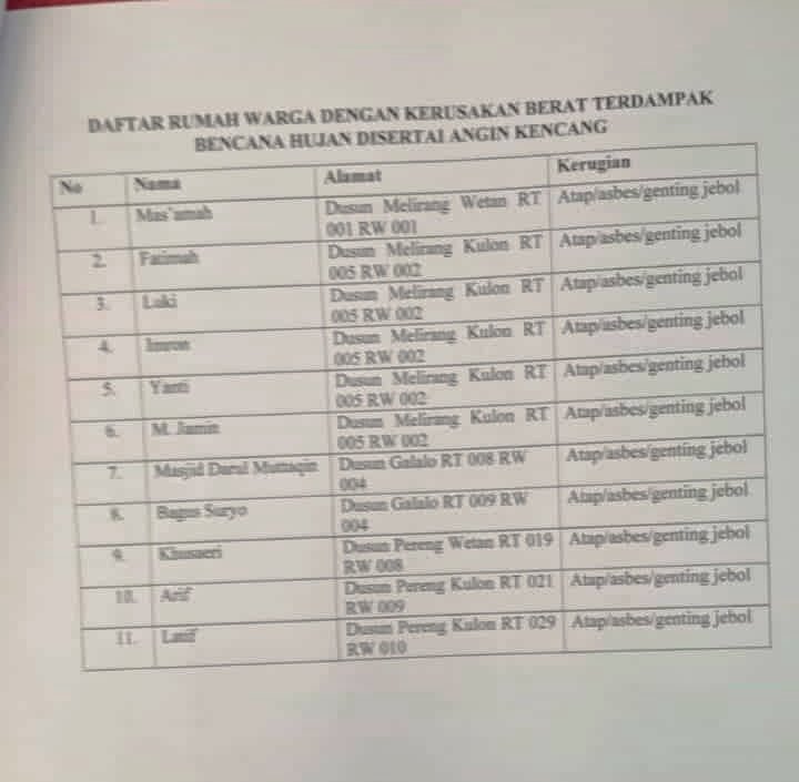Cak Noto Utomo sapaan akrabnya meminta pemerintah daerah untuk memberikan perhatian serius terhadap perbaikan rumah warga yang mengalami kerusakan pada saat terjadi peristiwa puting beliung beberapa waktu lalu.