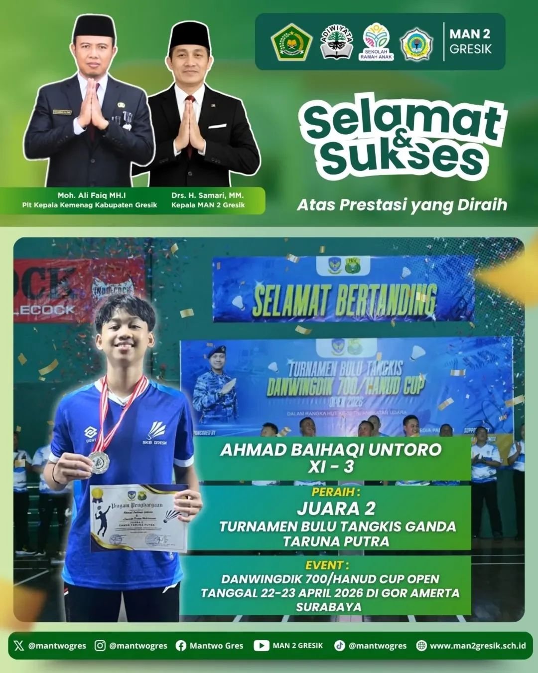GRESIK, BN News – MAN 2 Gresik kembali menorehkan tinta emas di lapangan bulu tangkis. Ahmad Baihaqi Untoro, siswa kelas XI-3, sukses meraih gelar Juara 2 Ganda Taruna Putra dalam ajang bergengsi Danwingdik 700/Hanud Cup Open 2026.