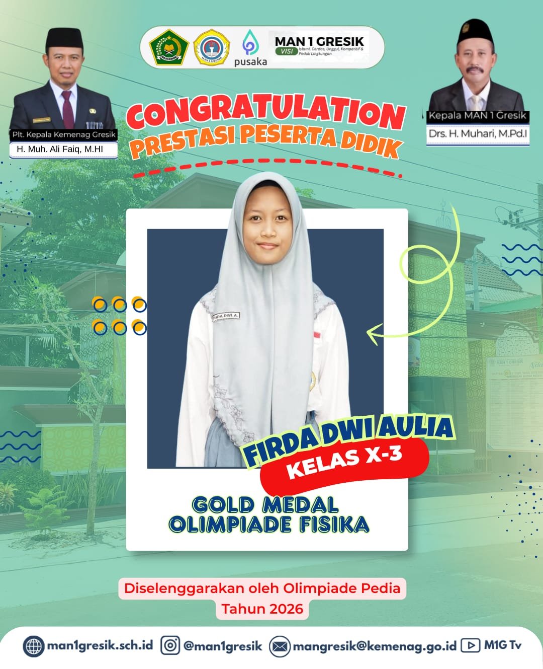 “Alhamdulillah, kami bangga atas prestasi yang diraih oleh Firda Dwi Aulia. Raihan Gold Medal Olimpiade Fisika ini merupakan bukti bahwa siswa MAN 1 Gresik mampu bersaing dan berprestasi di tingkat nasional. Semoga keberhasilan ini menjadi inspirasi bagi seluruh peserta didik untuk terus berusaha, berdoa, dan berprestasi, terlebih di bulan Ramadhan yang penuh keberkahan ini. Teruslah berkarya dan harumkan nama madrasah.”