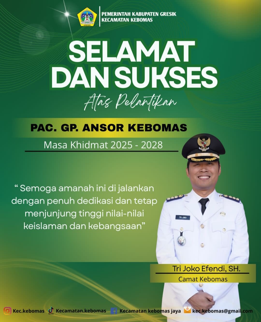 GRESIK, BN News – Camat Tri Joko Efendi, SH., yang juga Ketua Dewan Pertimbangan MUI (Majelis Ulama Indonesia) Kecamatan Kebomas mengucapkan Selamat dan Sukses atas Pelantikan PAC GP (Pimpinan Anak Cabang Gerakan Pemuda) Ansor Kebomas masa khidmat 2025–2028.