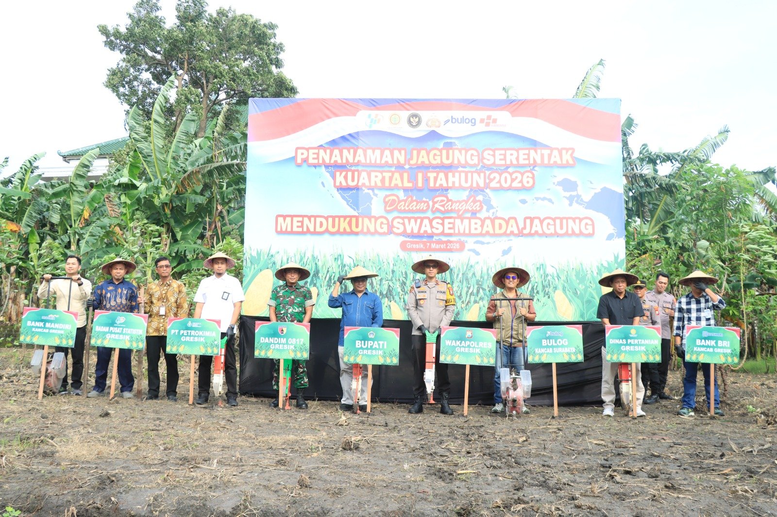 Mewakili Kapolres Gresik, Wakapolres Kompol Shabda Purusha Putra, memimpin langsung jalannya kegiatan penanaman jagung bersama para tamu undangan. Turut hadir Asisten I Pemerintah Kabupaten Gresik Suprapto, Danramil Kebomas Kapten Inf. Mujiantoro, serta perwakilan dari Dinas Pertanian, Badan Pusat Statistik (BPS), PT Petrokimia Gresik, dan pihak perbankan dari BRI serta Bank Mandiri.