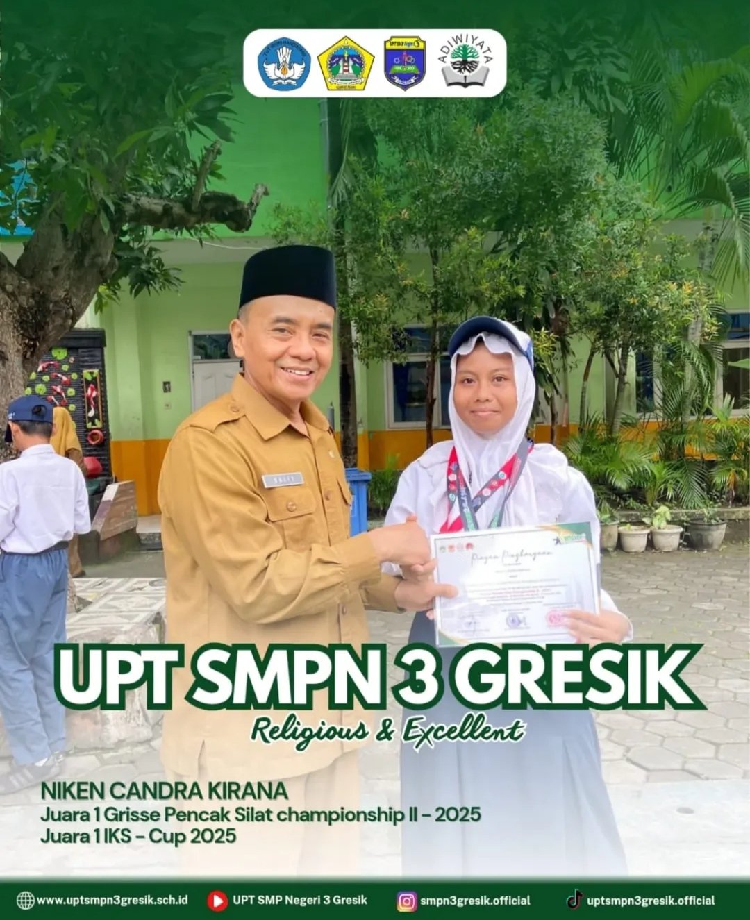 GRESIK, BN News – Selamat dan apresiasi yang setinggi-tingginya kepada Niken Candra Kirana, peserta didik UPT SMPN 3 Gresik atas prestasi yang diraih: