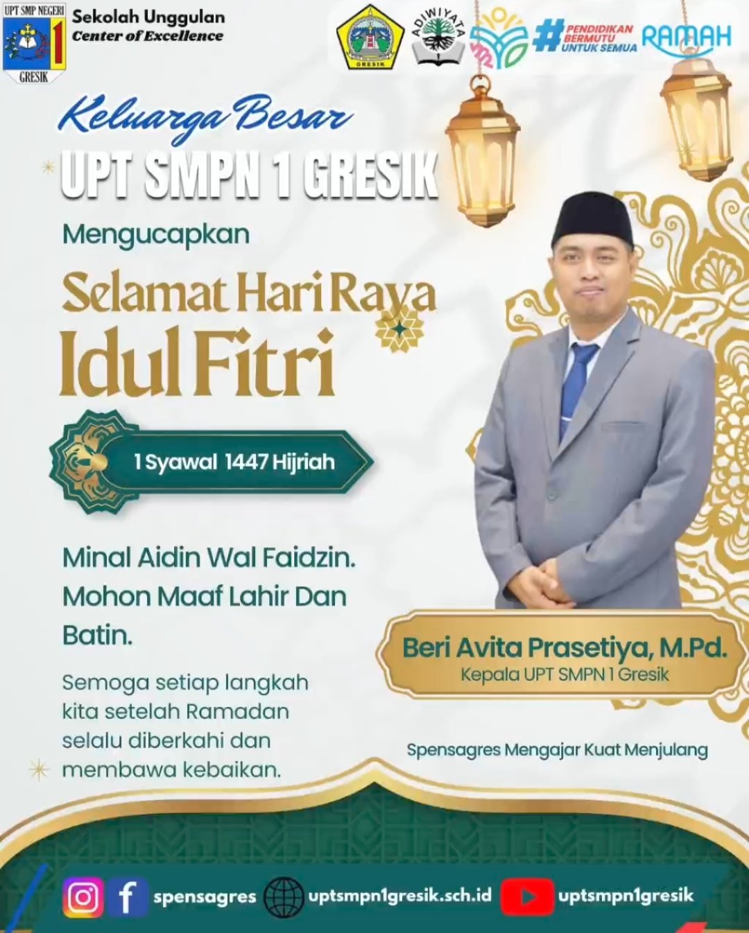 GRESIK, BN News – Keluarga Besar UPT SMPN 1 Gresik (Spensagres) dengan penuh kerendahan hati dan ketulusan mengucapkan Selamat Hari Raya Idul Fitri 1447 H / 2026 M.