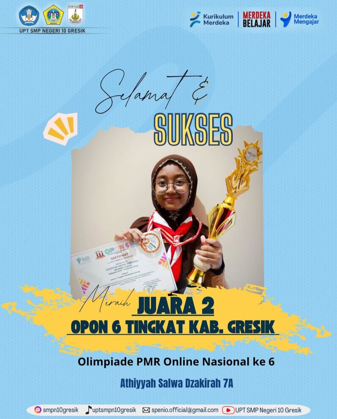 GRESIK, BN News – Tiada hari tanpa mengukir prestasi benar-benar layak disematkan untuk UPT SMPN 10 Gresik. Kali ini, prestasi gemilang dipersembahkan oleh Athiyyah Salwa Dzakirah kelas 7A yang berhasil meraih