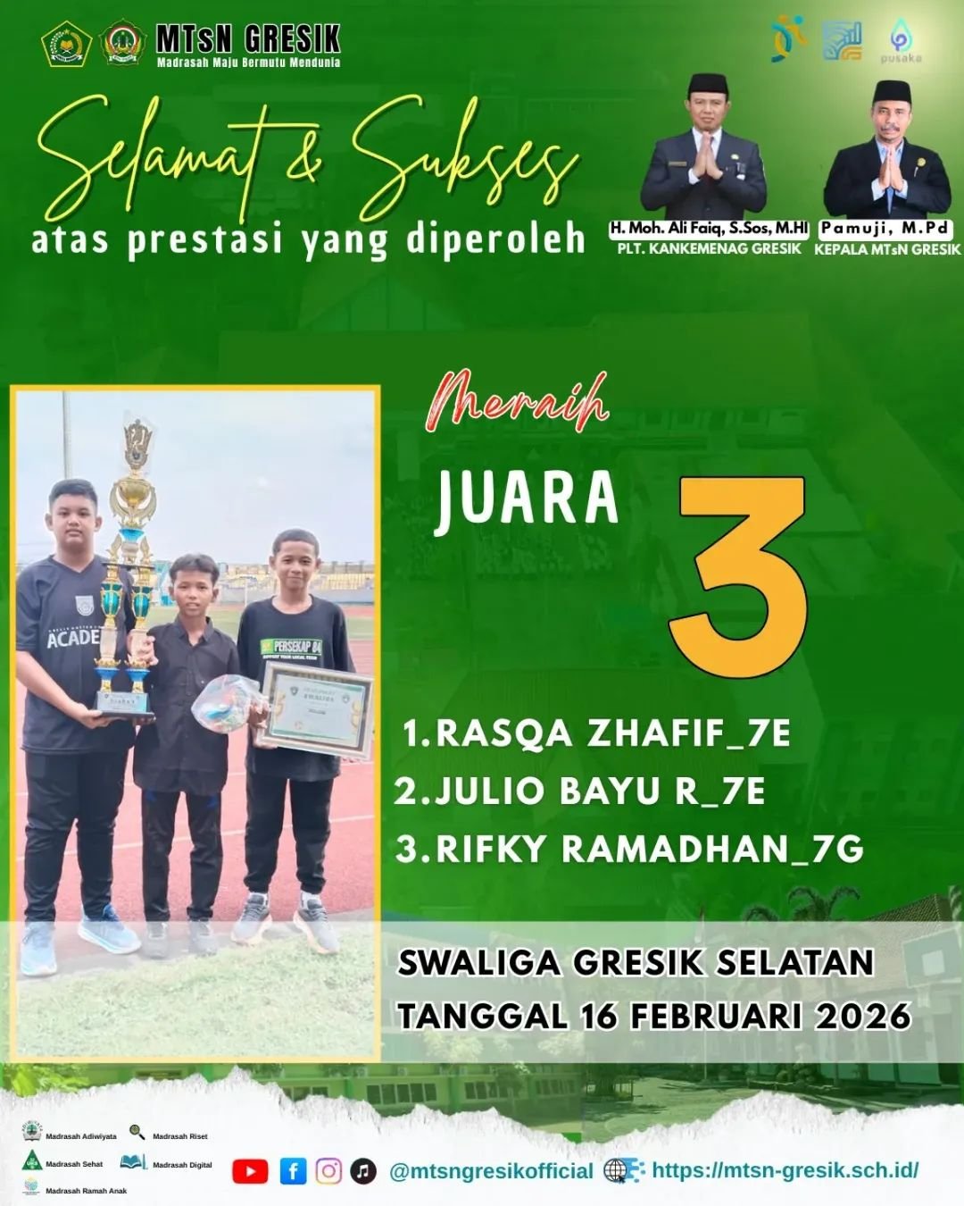 GRESIK, BN News – Kabar prestasi murid-murid MTsN Gresik kembali datang. Kali ini prestasi di raih di ajang “Swaliga Gresik Selatan” pada tanggal 16 Februari 2026. Berikut nama murid berprestasi;