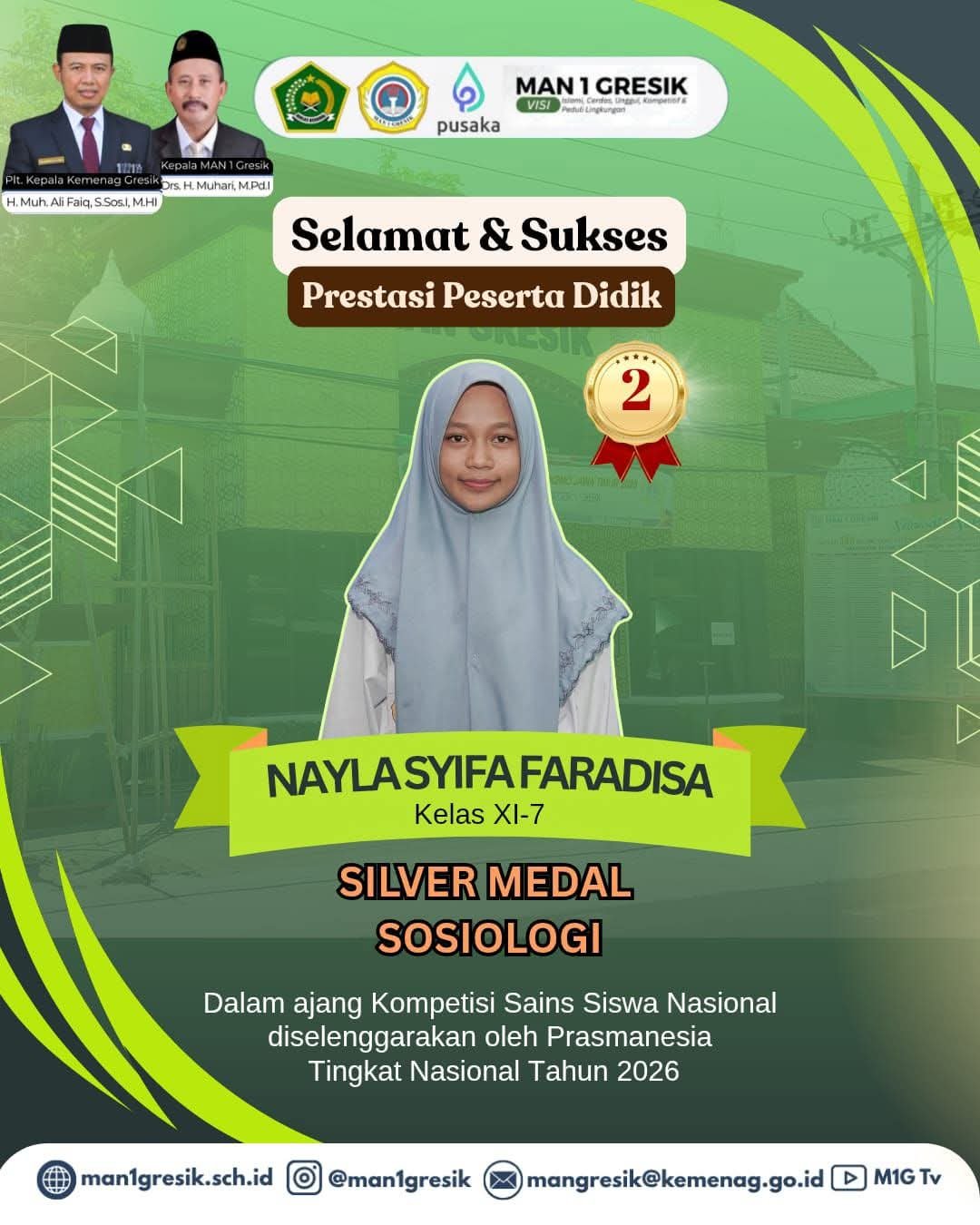 “Kami mengucapkan selamat dan sukses kepada Ananda Nayla Syifa Faradisa atas raihan Medali Perak bidang Sosiologi di tingkat nasional. Prestasi ini adalah hasil dari kerja keras, doa, serta sinergi antara peserta didik, guru pembimbing, dan orang tua. Semoga capaian ini menjadi motivasi untuk terus berprestasi dan membawa manfaat, baik bagi diri sendiri maupun bagi MAN 1 Gresik.”