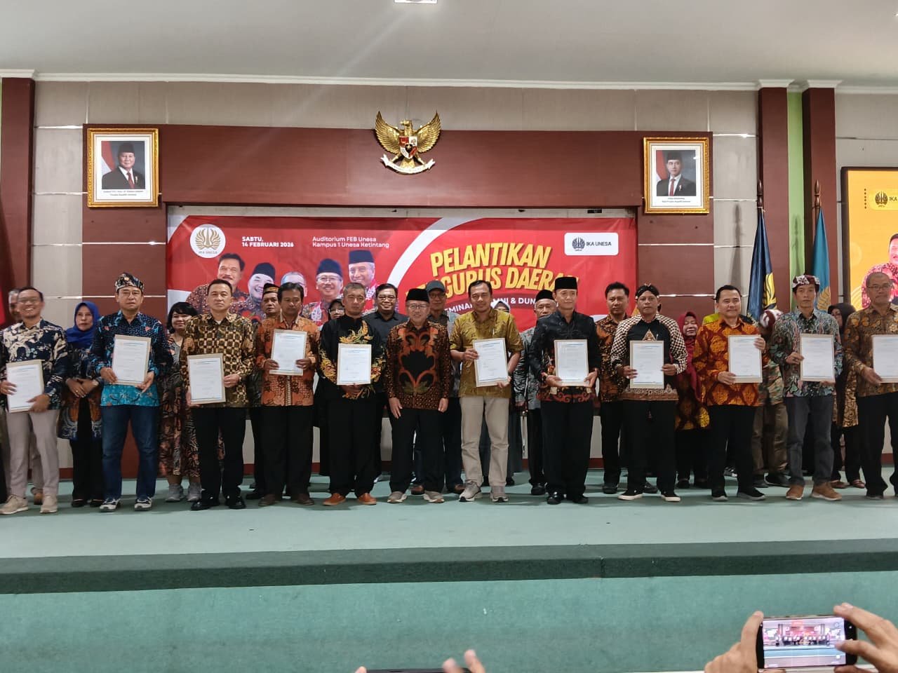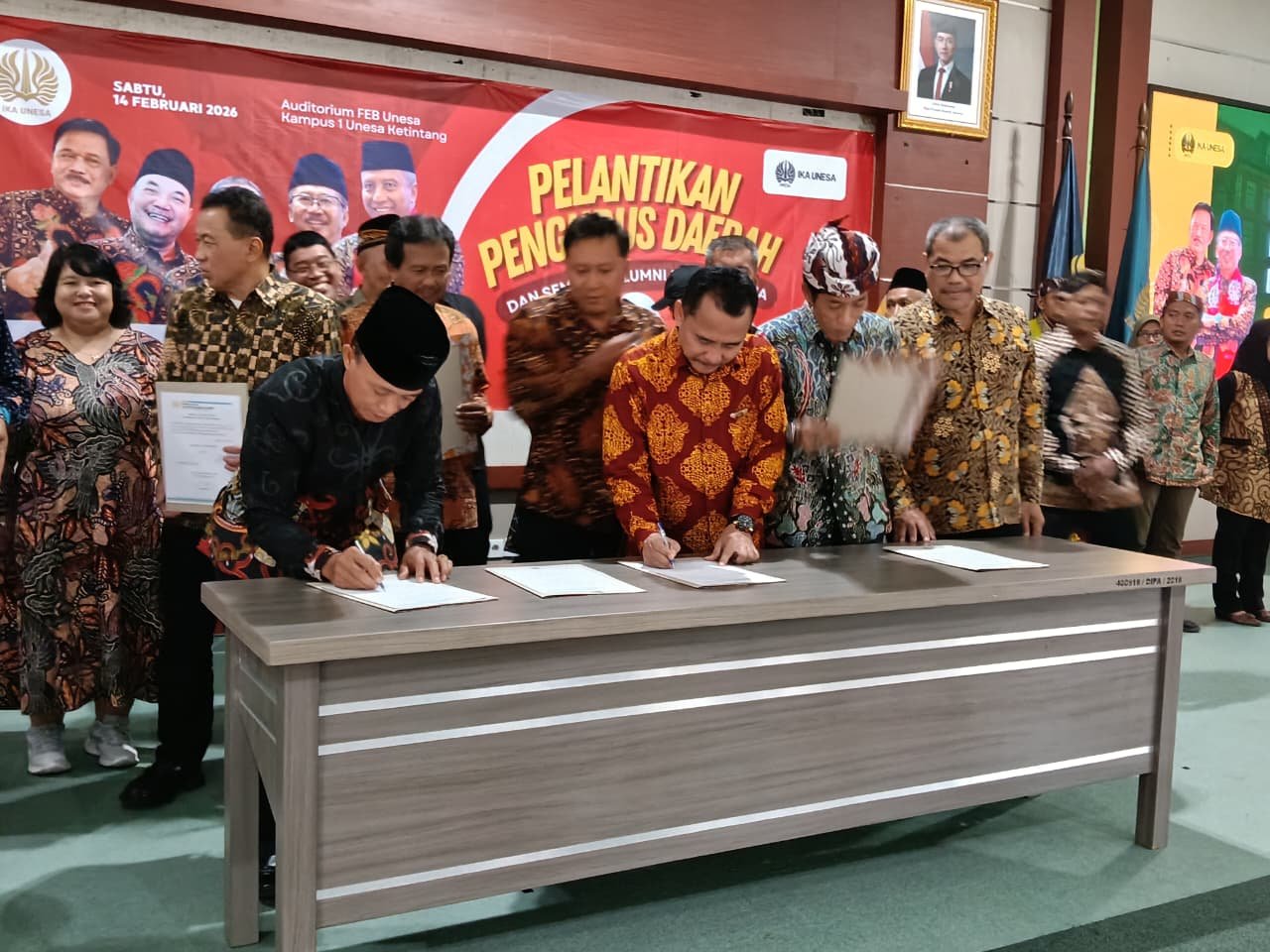 Pelantikan dilakukan langsung oleh Ketua Umum Pengurus Pusat (PP) IKA Unesa, Bambang DH bersama 14 pengurus cabang IKA Unesa periode 2026–2031 di Auditorium Fakultas Ekonomi dan Bisnis, Kampus I Ketintang, Universitas Negeri Surabaya, Sabtu (14/2/2026).