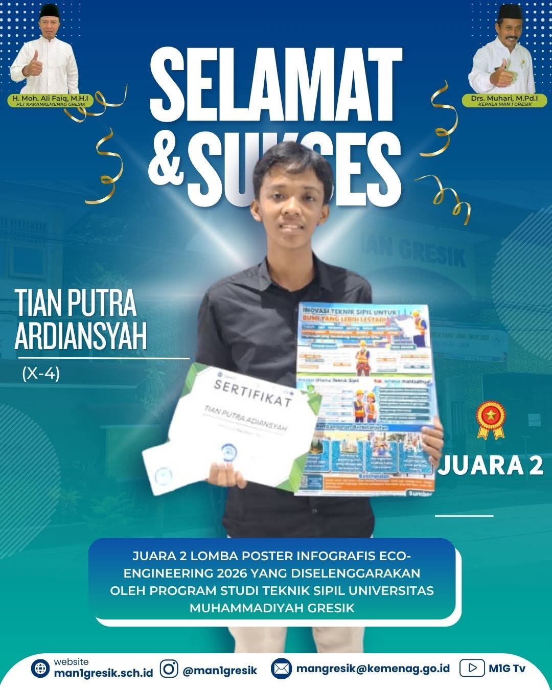 GRESIK, BN News – Memasuki pekan-pekan terakhir bulan April, prestasi membanggakan terus ditorehkan oleh siswa MAN 1 Gresik. Kali ini prestasi berhasil dipersembahkan oleh Tian Putra Ardiansyah. Siswa kelas X-4 MAN 1 Gresik itu sukses meraih Juara 2 Lomba poster Eco Engineering Tingkat Nasional yang diselenggarakan oleh Universitas Muhammadiyah Gresik (UMG) Tahun 2026.