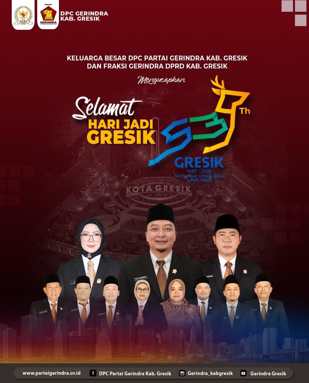 GRESIK, BN News – Keluarga Besar DPC Partai Gerindra dan Fraksi Gerindra DPRD Gresik mengucapkan Selamat Hari Jadi ke-539 untuk Kabupaten Gresik.