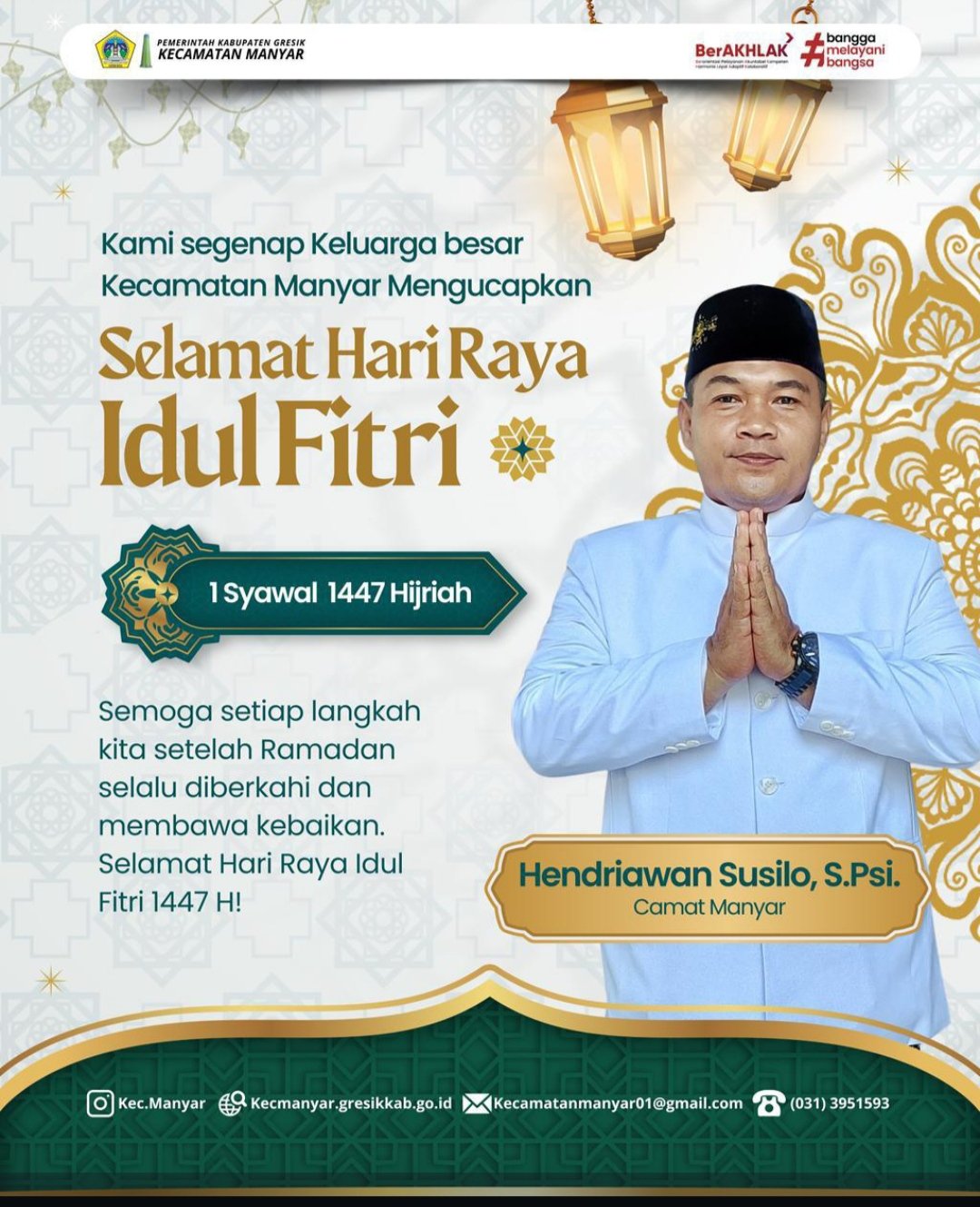 GRESIK, BN News – Keluarga Besar Kecamatan Manyar Kabupaten Gresik dengan penuh kerendahan hati dan ketulusan mengucapkan Selamat Hari Raya Idul Fitri 1447 H / 2026 M.