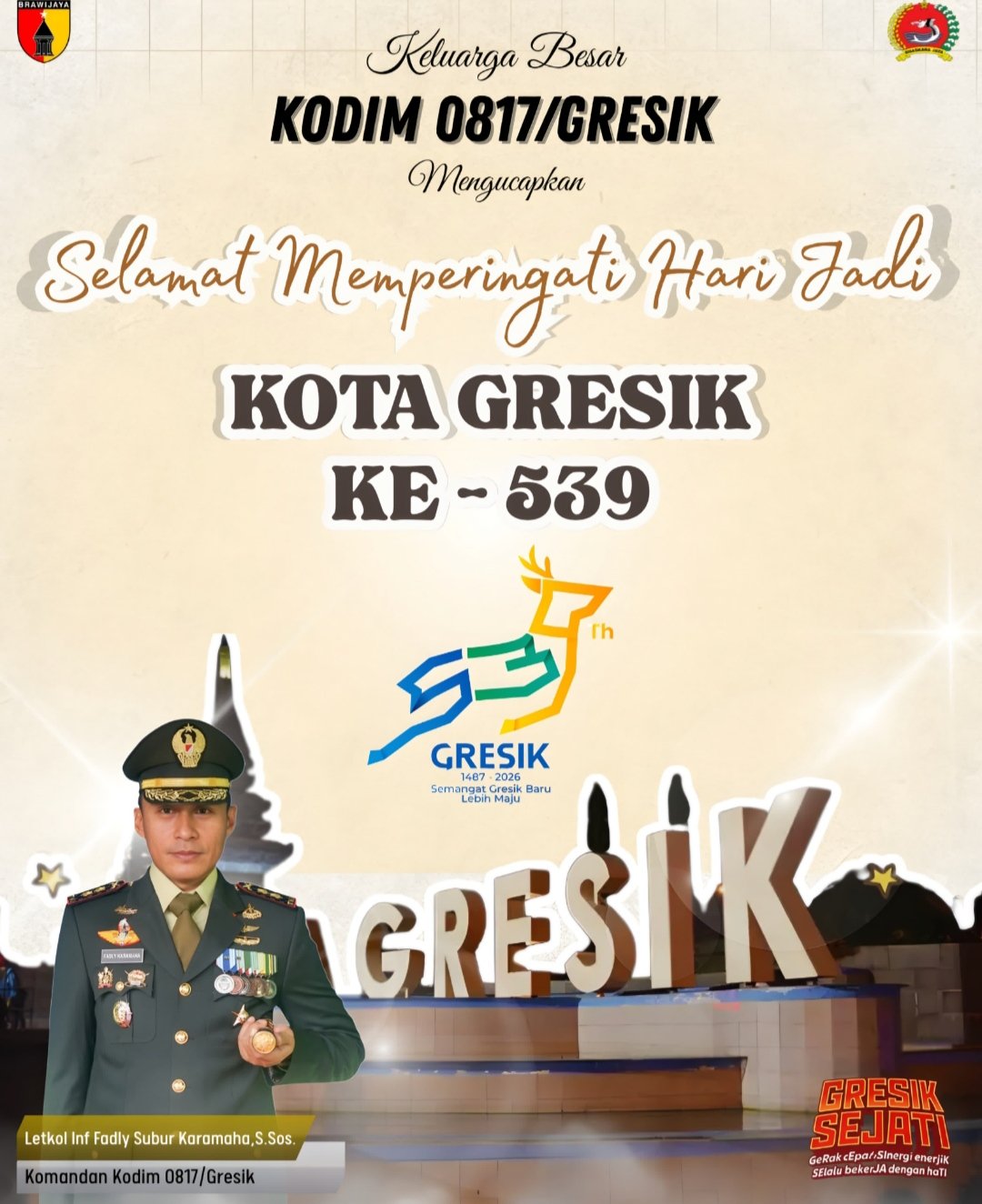 GRESIK, BN News – Segenap Keluarga Besar Kodim 0817/Gresik mengucapkan Selamat Hari Jadi ke-539 untuk Kabupaten