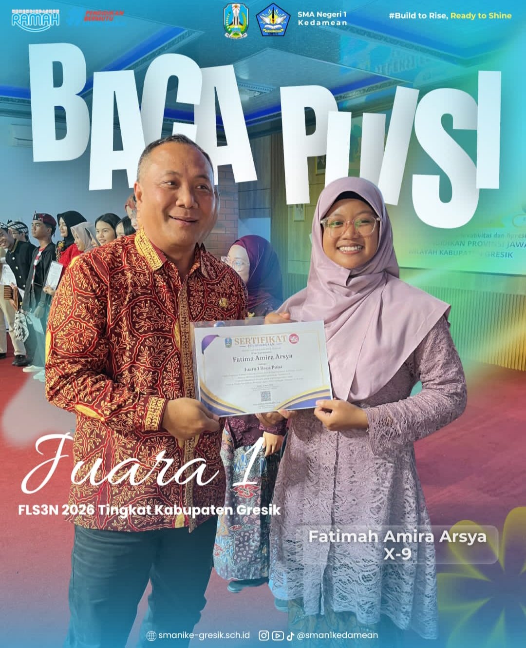 “Kami mengucapkan selamat dan sukses kepada Fatimah Amira Arsya atas prestasi Juara 1 Lomba Baca Puisi yang diraih pada ajang FLS3N 2026 tingkat Kabupaten Gresik. Semoga capaian ini menjadi motivasi bagi seluruh siswa SMAN 1 Kedamean Gresik untuk terus mengembangkan bakat, berani berkompetisi, dan mengharumkan nama sekolah di berbagai bidang,” ujar Bu Nurul sapaan akrabnya, Sabtu (25/4/2026).