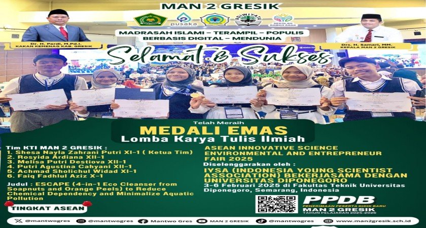 Kepala MAN 2 Gresik, Drs. H. Samari, MM, memberikan apresiasi atas capaian luar biasa ini. “Kami sangat bangga dengan prestasi yang diraih oleh tim ESCAPE. Mereka telah membuktikan bahwa inovasi berbasis sains dan lingkungan dapat menjadi solusi nyata bagi permasalahan global. Semoga pencapaian ini menjadi motivasi bagi siswa lain untuk terus berkarya dan berinovasi di bidang ilmu pengetahuan dan teknologi,” ujarnya, Senin (10/2/2025).