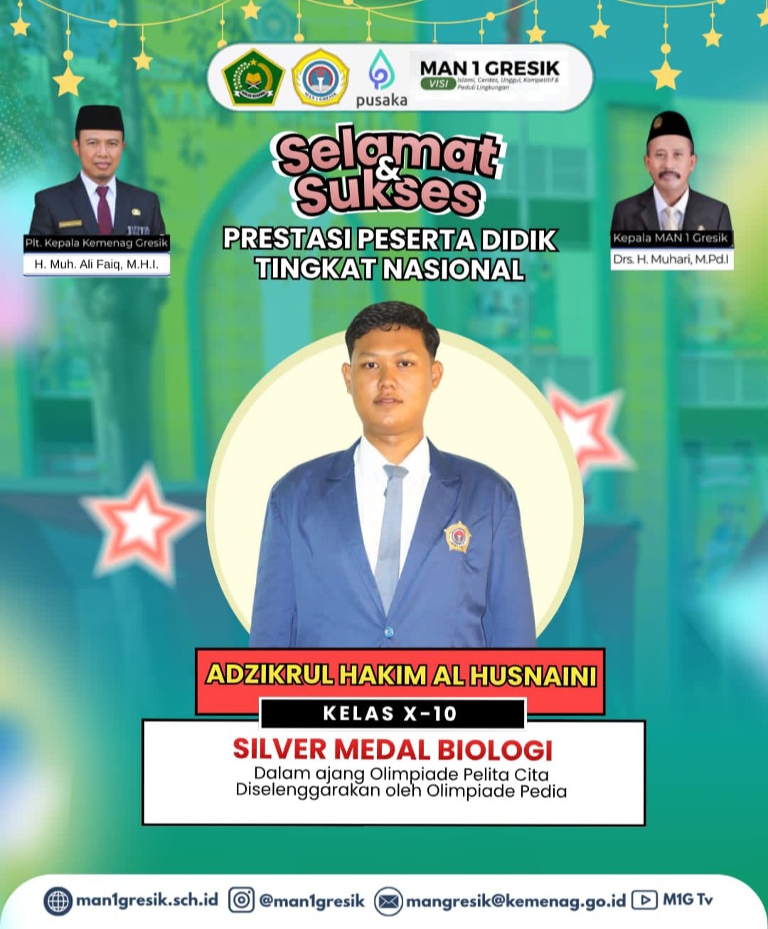 Kepala MAN 1 Gresik, Drs. H. Muhari, M.Pd.I mengucapkan selamat kepada Adzikrul Hakim Al Husnaini yang berhasil mengharumkan nama madrasah. Beliau berpesan agar terus meningkatkan prestasi. Tidak mudah puas dengan apa yang sudah didapat, namun terus mengembangkan raihan medali maupun trofi dalam berbagai ajang.