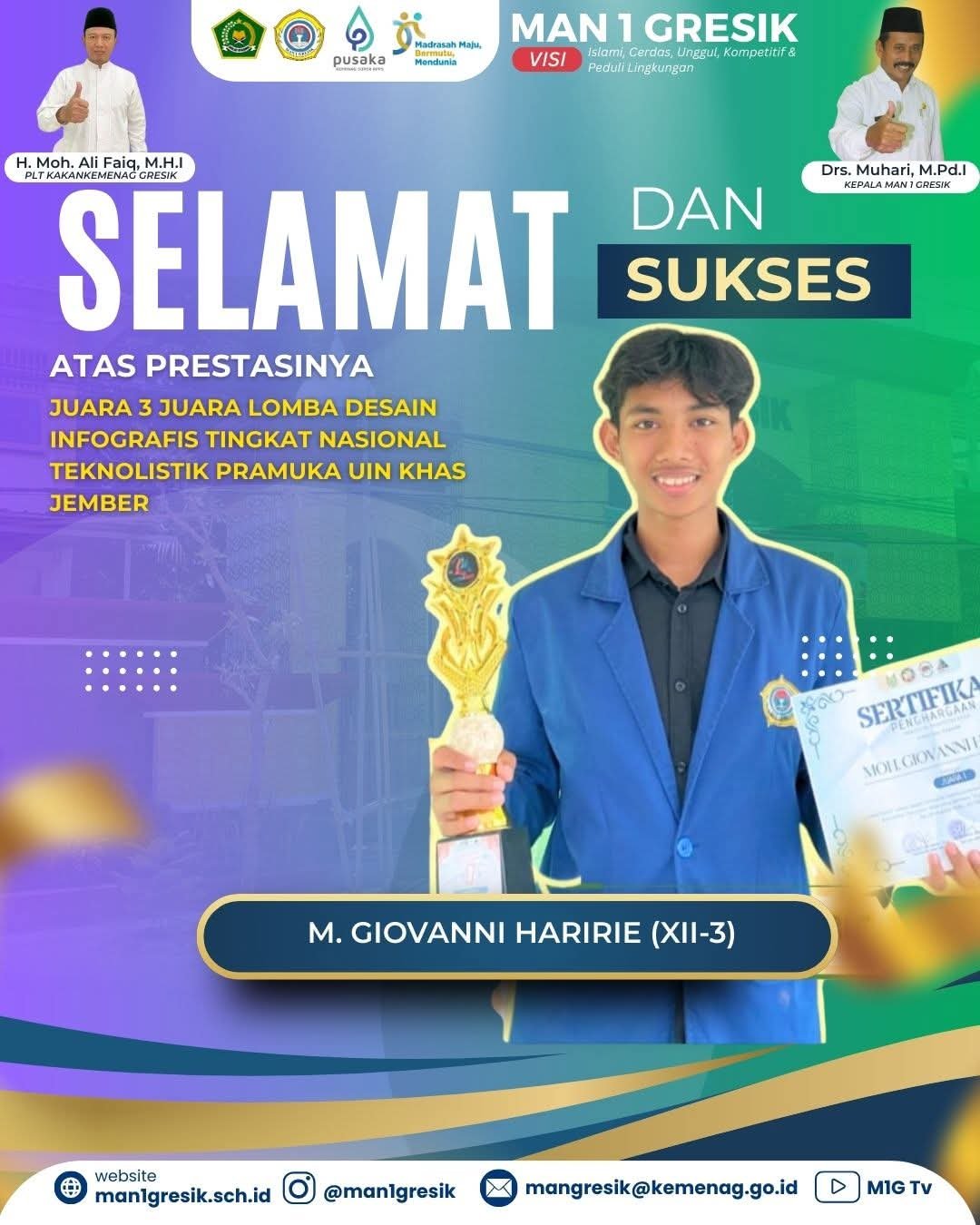 Keberhasilan tersebut tidak lepas dari ketekunan, semangat belajar, serta kemampuan M. Giovanni Haririe dalam menuangkan ide-ide kreatif ke dalam karya desain yang informatif dan komunikatif. Prestasi ini sekaligus menunjukkan bahwa siswa MAN 1 Gresik mampu beradaptasi dengan perkembangan teknologi dan inovasi digital, sejalan dengan visi madrasah yang islami, cerdas, unggul, kompetitif, dan peduli lingkungan.