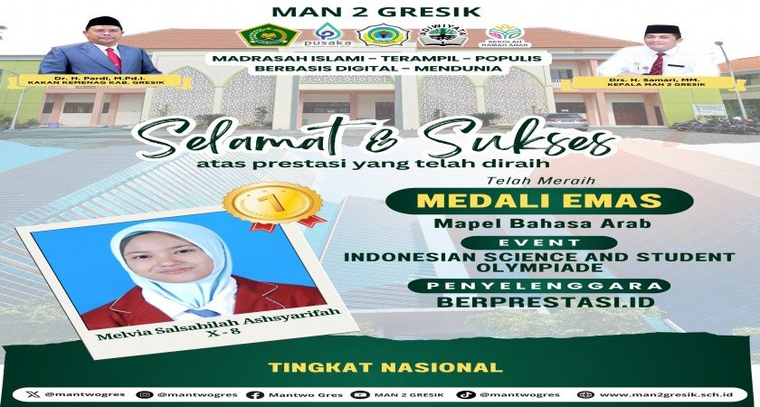 Keberhasilan ini semakin memperkuat posisi MAN 2 Gresik sebagai madrasah unggulan dalam berbagai ajang akademik nasional. Semoga prestasi Melvia menginspirasi siswa lainnya untuk terus berkembang dan mengukir lebih banyak pencapaian di masa depan! (Didik Hendri Telisik Hati)