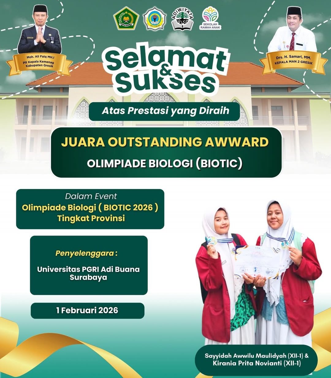 GRESIK, BN News – Selamat & Sukses! Sayyidah Awwilu Maulidyah (XII-1) & Kirania Prita Novianti (XIl-1) berhasil meraih Juara Outstanding Award pada Olimpiade Biologi (BIOTIC 2026)Tingkat Provinsi yang