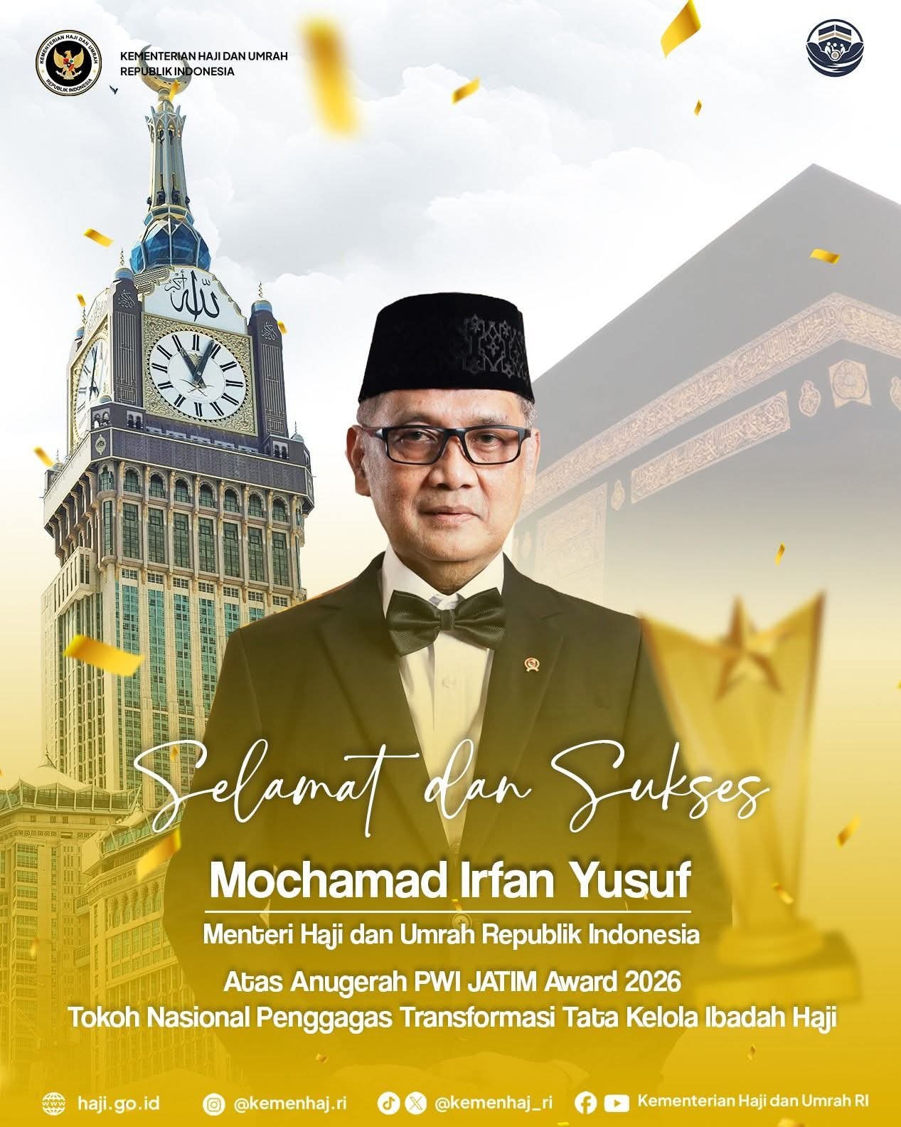 BN News – 𝐒𝐞𝐥𝐚𝐦𝐚𝐭 𝐝𝐚𝐧 𝐒𝐮𝐤𝐬𝐞𝐬 !! Menteri Haji dan Umrah RI, Mochamad Irfan Yusuf (@gus.irfanyusuf) menerima penghargaan sebagai Tokoh Nasional Penggagas Transformasi Tata Kelola Ibadah Haji dari Persatuan Wartawan Indonesia (PWI) Jawa Timur.