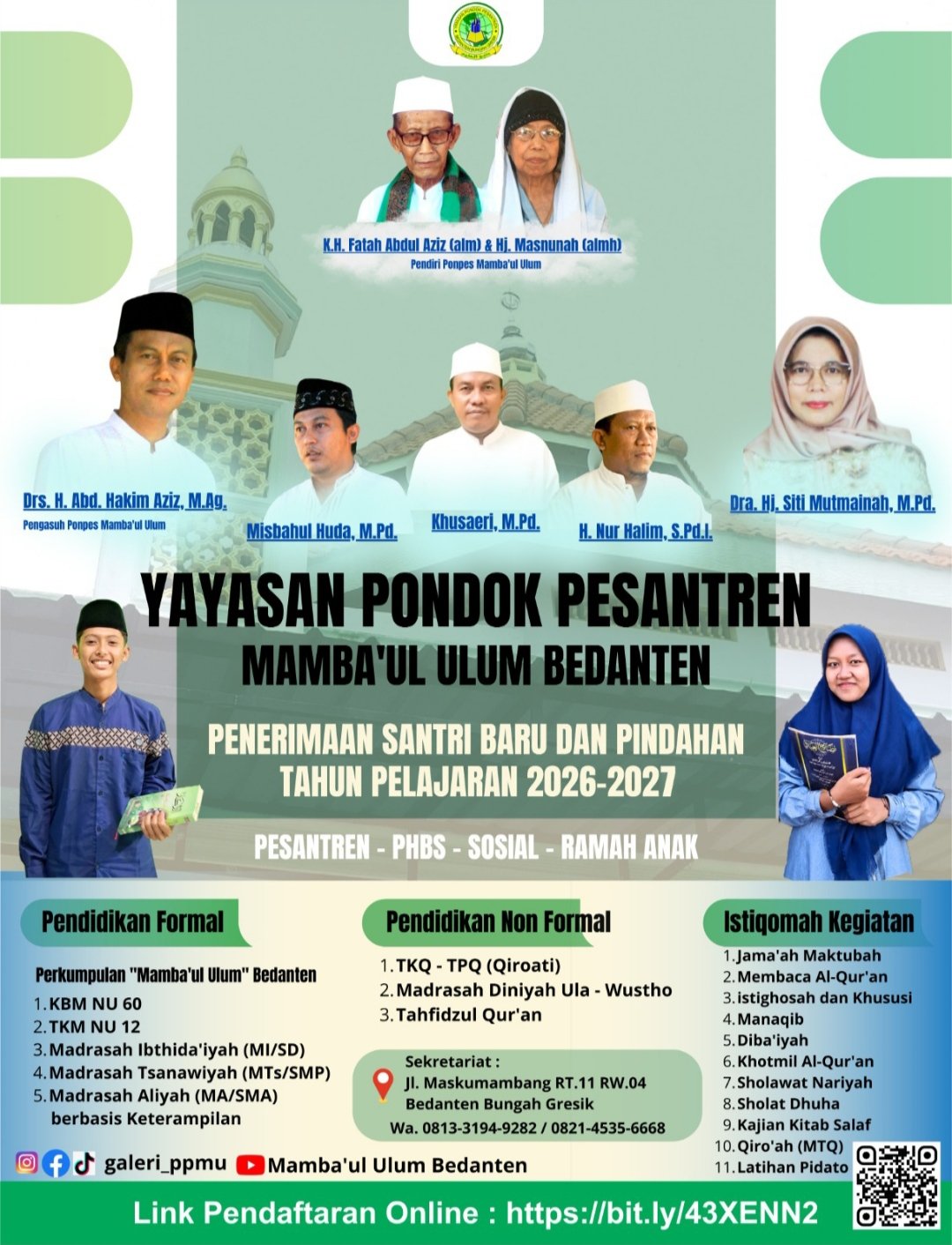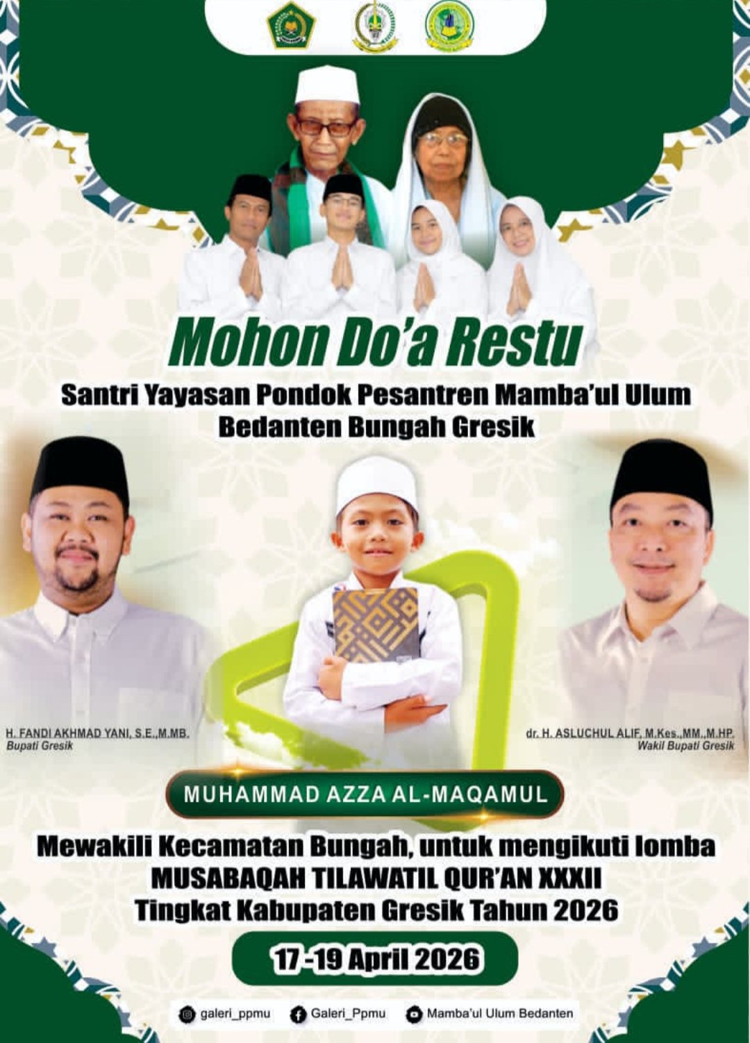 “Semoga santri kami Ananda Muhammad Azza Al-Maqamul dimampukan oleh Allah SWT memberikan hasil terbaik di Gelaran MTQ ke-XXXII Tingkat Kabupaten Gresik Tahun 2026, sehingga bisa membawa nama harum Kecamatan Bungah,” ucap Pengasuh Pondok Pesantren Mamba’ul Ulum Bedanten Bungah Drs. H. Abd. Hakim Aziz, M.Ag., Ahad (12/4/2026).