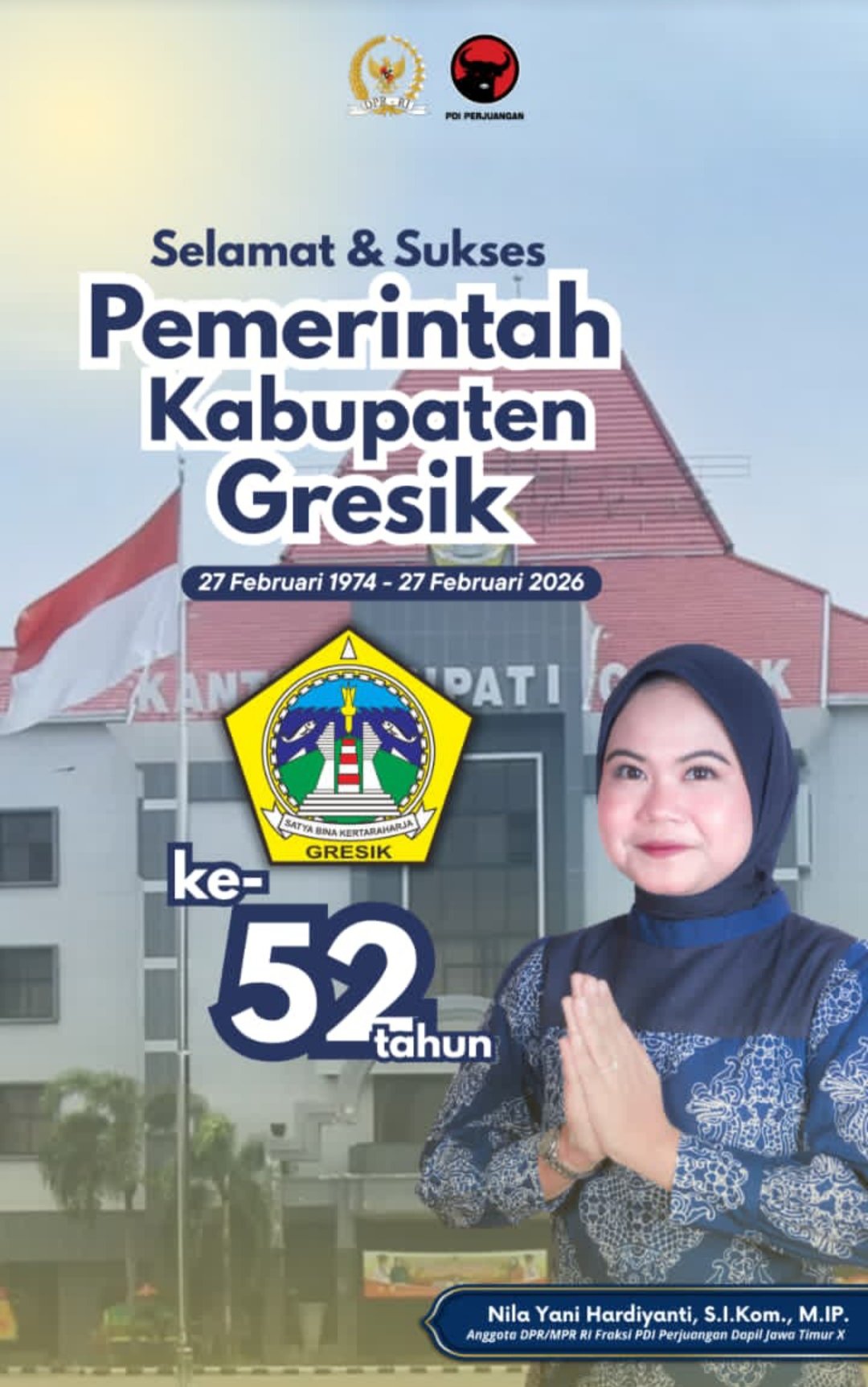 GRESIK, BN News – Anggota DPR RI Komisi VII Dapil X Jawa Timur Fraksi PDI Perjuangan, Nila Yani Hardiyanti, S.I.Kom., M.IP mengucapkan Selamat Memperingati Hari Jadi Kota Gresik ke-539 dan HUT Pemkab Gresik ke-52.