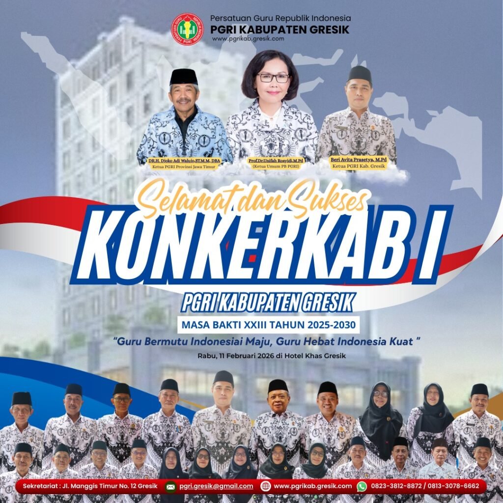 GRESIK, BN News – Selamat atas terselenggaranya Konferensi Kerja Kabupaten (Konkerkab) I PGRI Kabupaten Gresik Masa Bakti XXIII Tahun 2025-2030, Rabu, 11 Februari 2026 di Hotel Khas Gresik.
