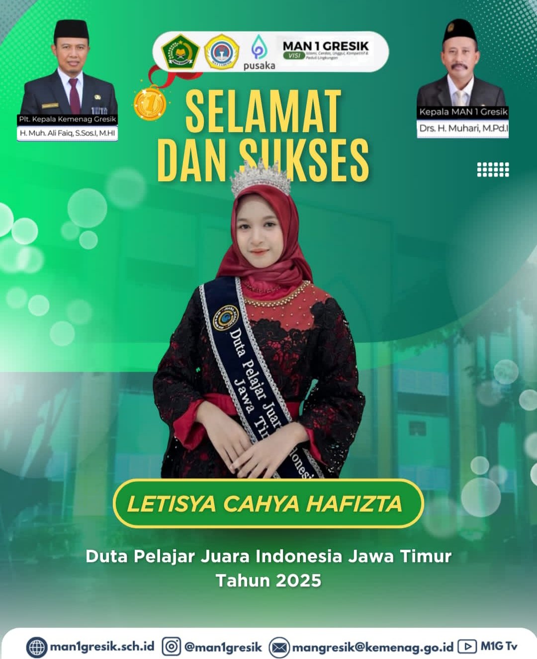 “Kami sangat bangga atas prestasi Letisya Cahya Hafizta yang telah terpilih sebagai Duta Pelajar Juara Indonesia Jawa Timur. Prestasi ini menunjukkan bahwa siswa MAN 1 Gresik tidak hanya unggul dalam bidang akademik, tetapi juga memiliki jiwa kepemimpinan dan kepedulian sosial yang tinggi. Semoga pencapaian ini menjadi inspirasi bagi seluruh siswa untuk terus berprestasi dan membawa nama baik madrasah di kancah yang lebih luas.”