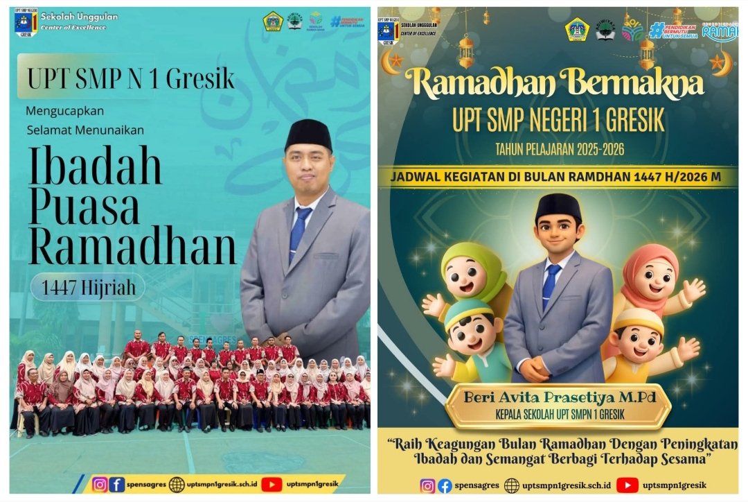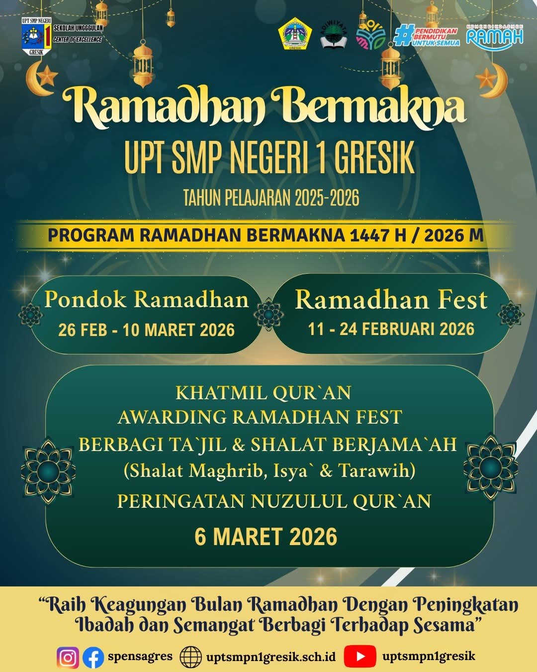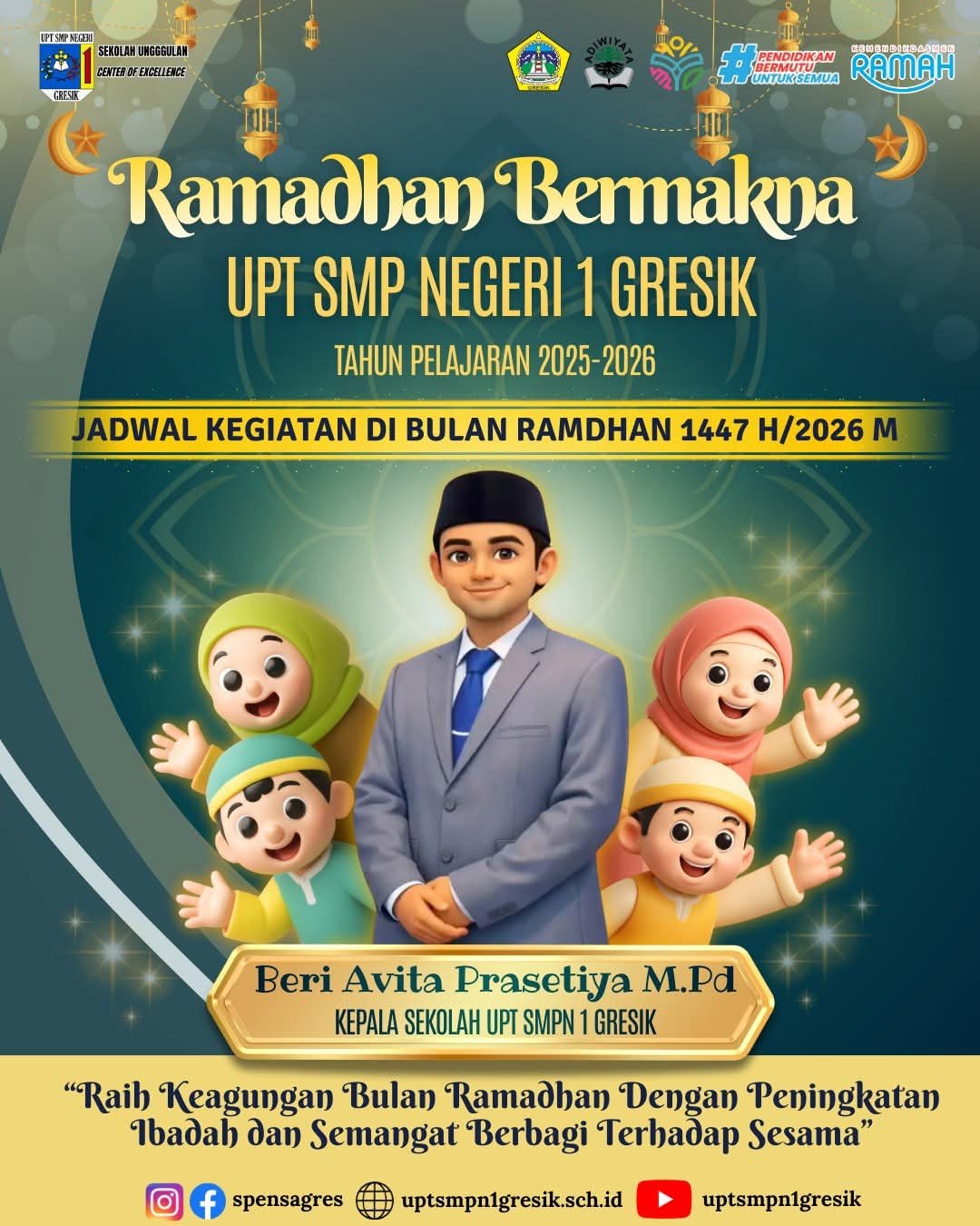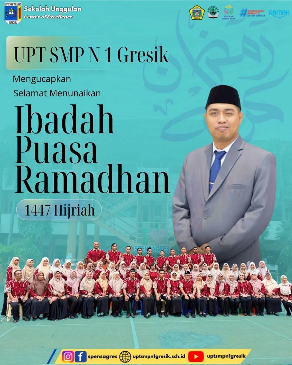 Untuk itu, Keluarga Besar UPT SMP Negeri 1 Gresik mengajak Meraih Keagungan Bulan Ramadan Dengan Peningkatan Ibadah dan Semangat Berbagi Terhadap Sesama.