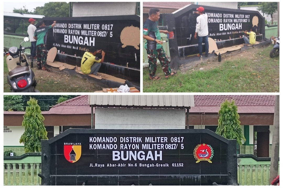 GRESIK, BN News — Dalam rangka menyambut Bulan Suci Ramadan sekaligus sebagai wujud kepedulian dan rasa bangga terhadap satuan, anggota Koramil 0817/15 Bungah melaksanakan pemugaran papan nama Makoramil agar tampak lebih representatif dan sedap dipandang. Kegiatan tersebut dilaksanakan secara swadaya oleh seluruh personel dengan penuh semangat kebersamaan.