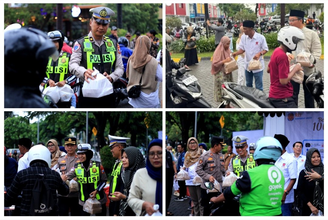 Kanit Kamsel Ipda Andreas bersama anggota Satlantas turut memastikan kegiatan berjalan aman, tertib, dan lancar, Personel bersama anggota REI Komisariat Gresik bahu-membahu membagikan paket takjil kepada pengendara roda dua, roda empat, hingga pejalan kaki.