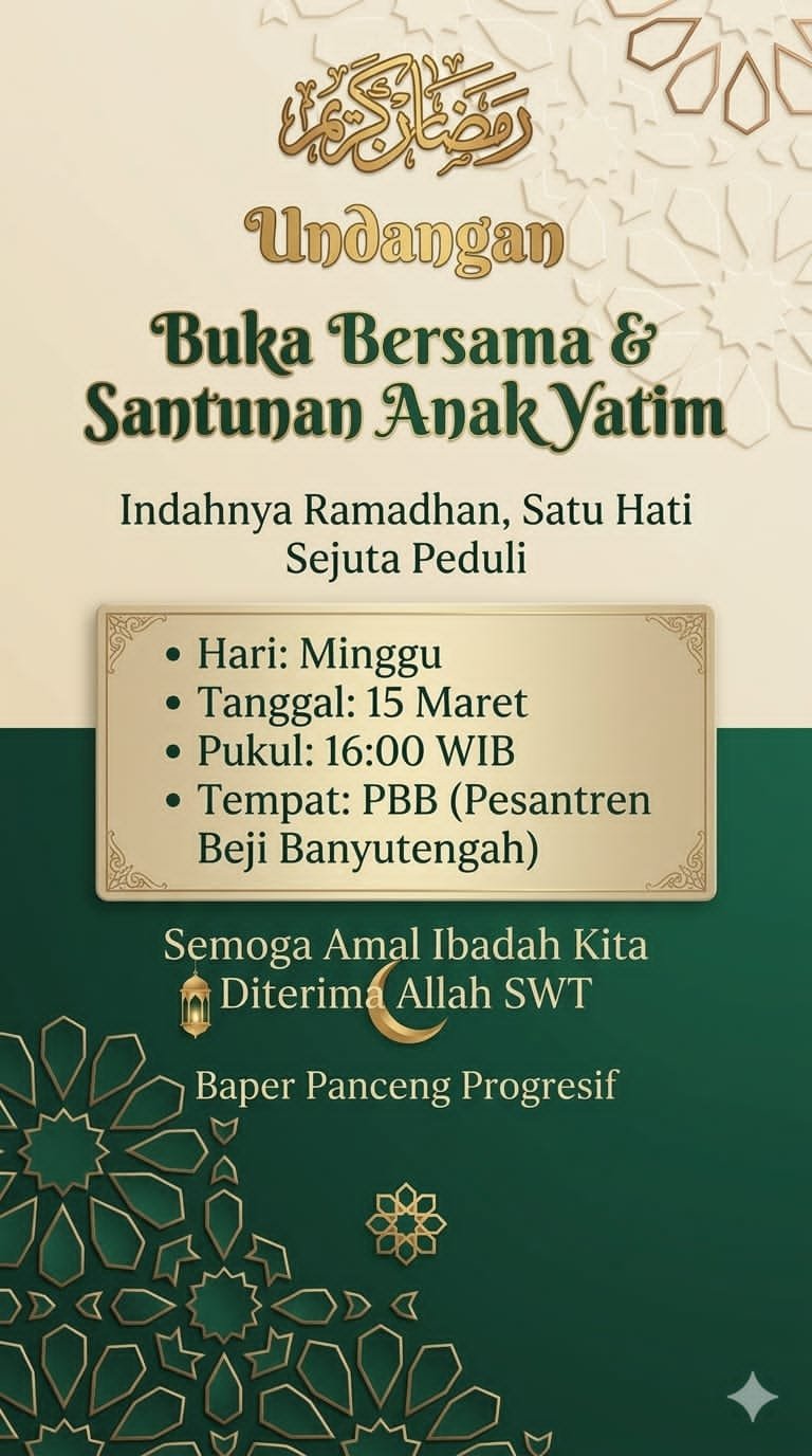 Kali ini, dengan penuh rasa syukur dan berbalut kasih sayang, Baper Panceng Progresif menggelar Buka Bersama & Santunan untuk 70 Anak Yatim di Pesantren Beji Banyutengah (PBB) Panceng, Kabupaten Gresik, Jawa Timur, Minggu (15/3/2026).