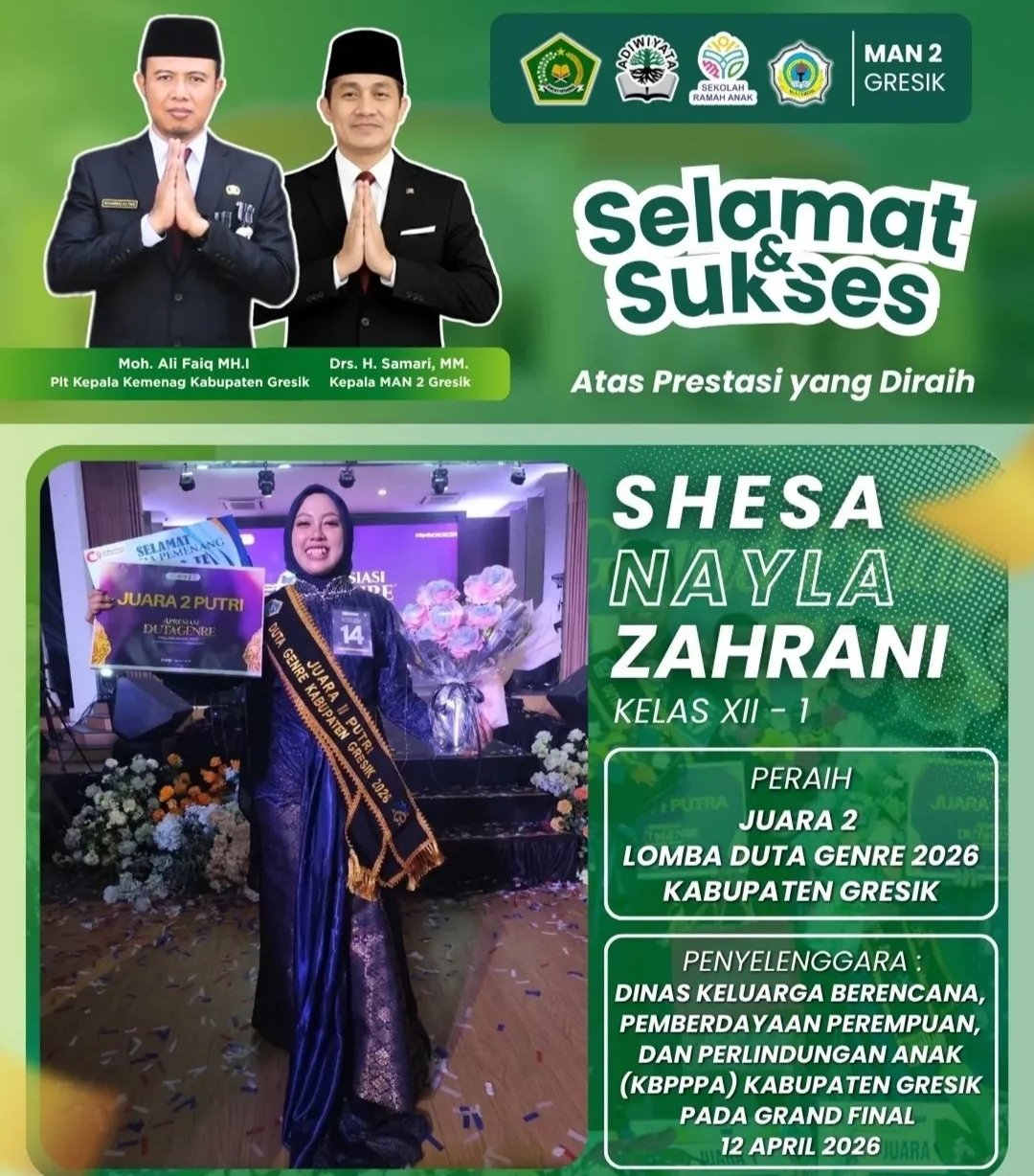 yang panjang dan sangat ketat, Shesa Nayla Zahrani, siswi kelas Xll-1,sukses meraih gelar Juara 2 Duta GenRe Kabupaten Gresik 2026.