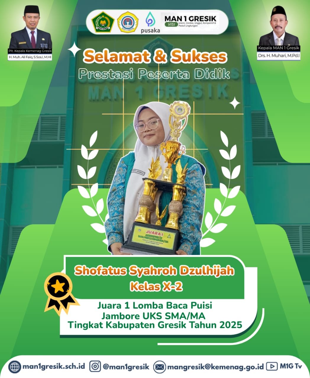 Prestasi ini menguatkan citra MAN 1 Gresik sebagai madrasah berprestasi, sekaligus menunjukkan bahwa para peserta didiknya tidak hanya unggul dalam akademik, tetapi juga dalam bidang seni dan literasi.
