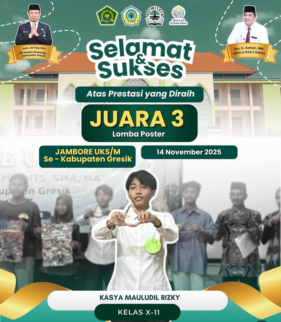 Kali ini prestasi cemerlang dipersembahkan oleh Kasya Mauludil Rizky, siswa MAN 2 Gresik (Kelas X-11) yang berhasil meraih Juara 3 Lomba Poster pada Jambore UKS/M se-Kabupaten Gresik. MAN 2 Gresik bangga!