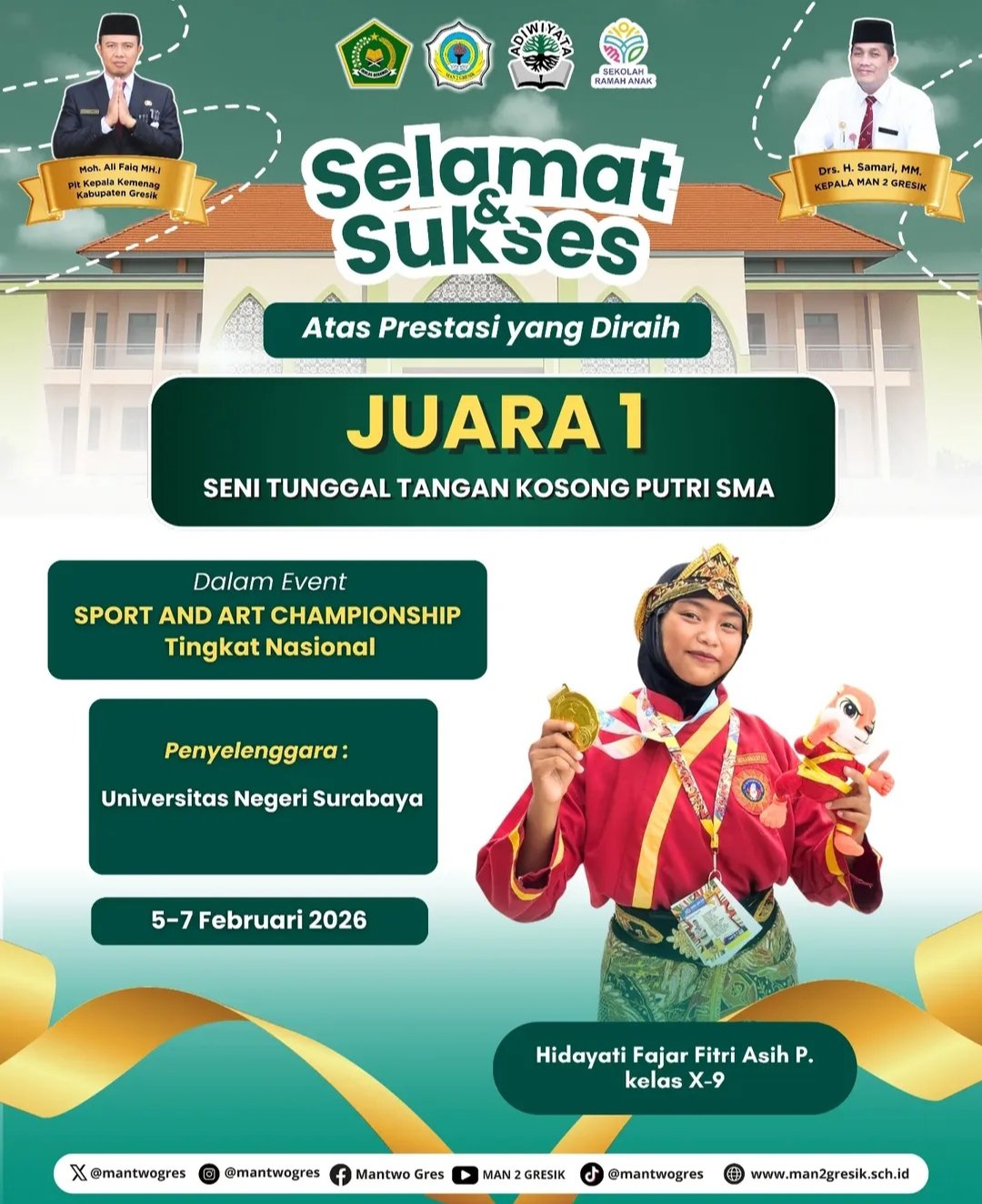 “Semoga prestasi ini menjadi motivasi bagi seluruh siswa-siswi MAN 2 Gresik untuk terus berprestasi!” ucap Kepala MAN 2 Gresik Drs. H. Samari, MM, Jumat Berkah (13/2/2026).