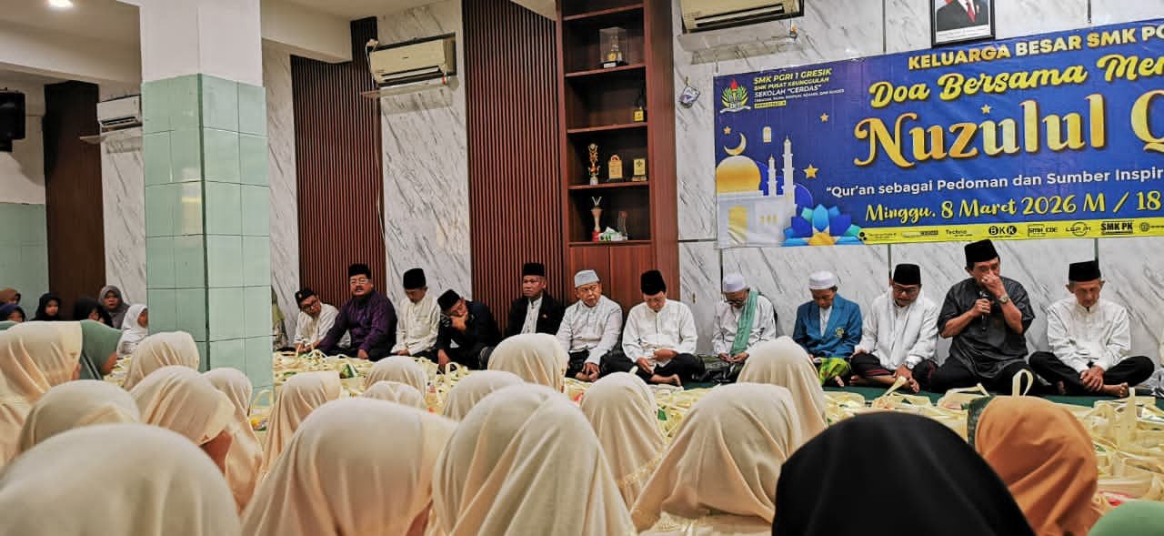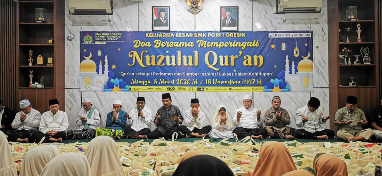 Seperti yang digelar Minggu (8/3/2026) kemarin, di bawah Komando Kepala SMK PGRI 1 Gresik Drs. Arief Susanto, M.Pd., menyelenggarakan Doa Bersama dan Peringatan Nuzulul Qur’an dengan mengusung tema “Qur’an sebagai Pedoman dan Sumber Inspirasi Sukses dalam Kehidupan”.