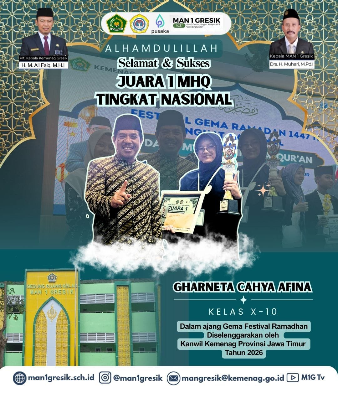 Keberhasilan ini tidak hanya menjadi kebanggaan pribadi dan keluarga, tetapi juga menjadi inspirasi bagi seluruh civitas akademika MAN 1 Gresik. Raihan Juara 1 tingkat nasional menunjukkan bahwa madrasah mampu mencetak generasi Qur’ani yang unggul, kompetitif, serta berkarakter.