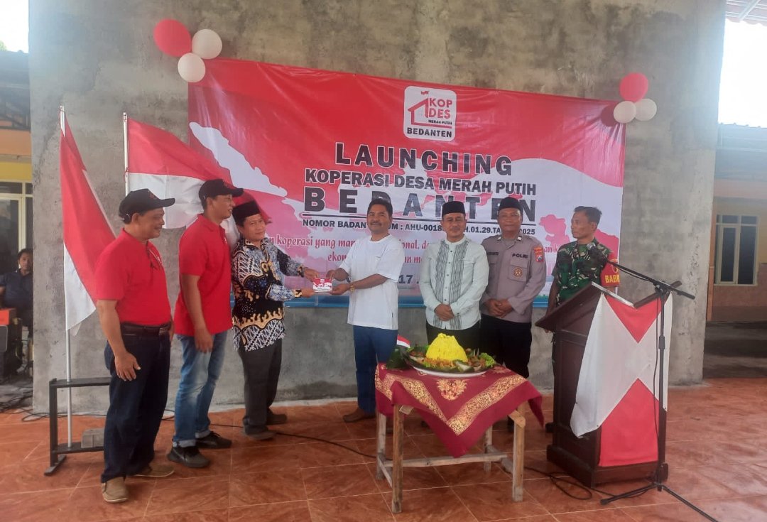 Dalam laporannya, Ketua Koperasi Merah Putih Bedanten Teguh Silva R menyampaikan rasa syukur atas diresmikannya Koperasi Desa Merah Putih Bedanten. “Untuk tahap awal kami buka gerai sembako dan nantinya akan dibuka juga gerai apotik dan gerai pupuk,” terangnya.