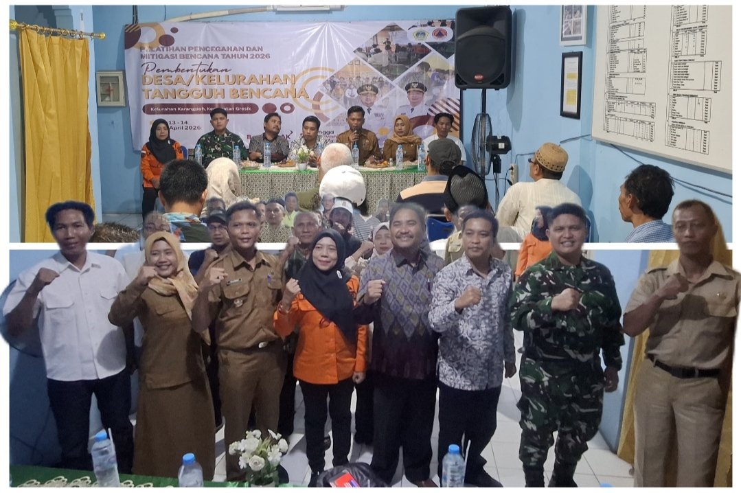 GRESIK, BN News – Upaya meningkatkan kesiapsiagaan masyarakat dalam menghadapi potensi bencana terus dilakukan pemerintah daerah. Salah satunya melalui kegiatan Pelatihan Pencegahan dan Mitigasi Bencana Tahun 2026 dalam rangka Pembentukan Desa/Kelurahan Tangguh Bencana (DESTANA) yang digelar di Aula Kantor Kelurahan Karangpoh, Jl. Samanhudi No. 161, Kecamatan Gresik, Kabupaten Gresik, dengan diikuti sekitar 40 peserta. Senin (13/4/2026).