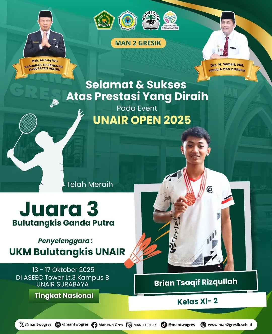 Gresik, yakni Brian Tsaqif Rizqullah dari kelas XI-2 yang berhasil meraih Juara 3 (Ganda Putra) dalam ajang bergengsi UNAIR OPEN 2025.