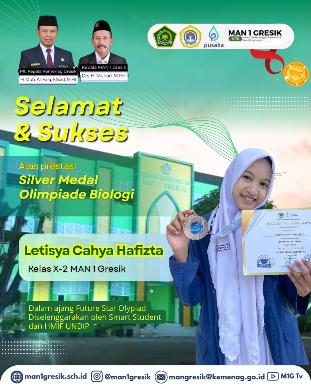 “Selamat kepada Letisya Cahya Hafizta atas prestasi yang membanggakan ini. Semoga capaian tersebut menjadi motivasi bagi seluruh siswa MAN 1 Gresik untuk terus berprestasi, berkompetisi secara sehat, dan membawa nama baik madrasah di kancah nasional maupun internasional.”