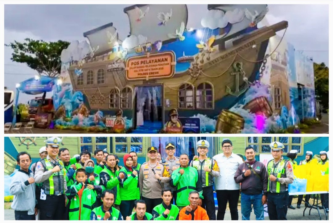 Mengusung tema Kapal Nyai Ageng Pinatih, pos ini tak hanya berfungsi sebagai tempat istirahat, tetapi juga sarana edukasi sejarah Gresik. Di dalamnya tersedia berbagai fasilitas seperti layanan SIM keliling, SKCK online, snack dan minuman gratis, hingga kursi pijat dan pijat tradisional.