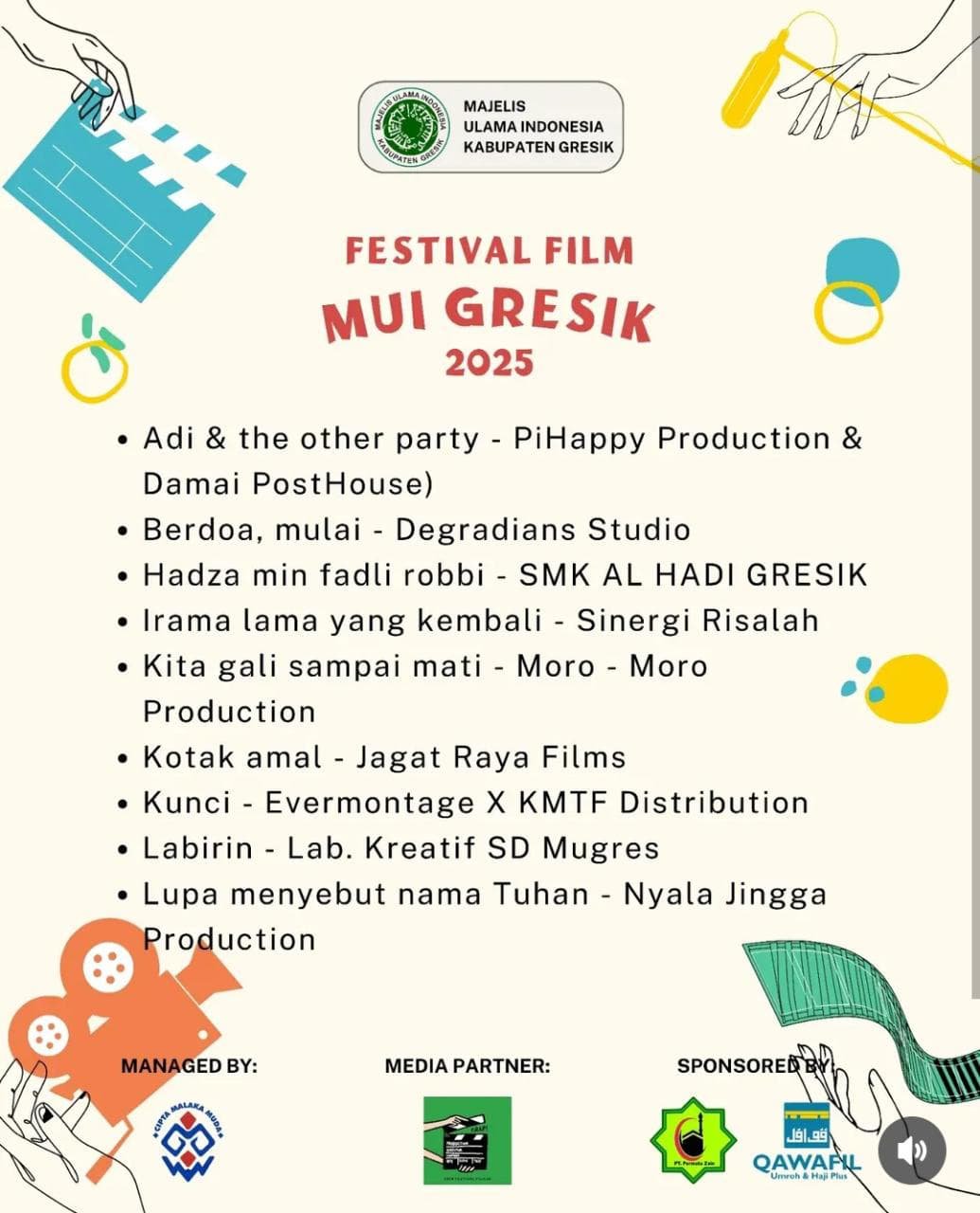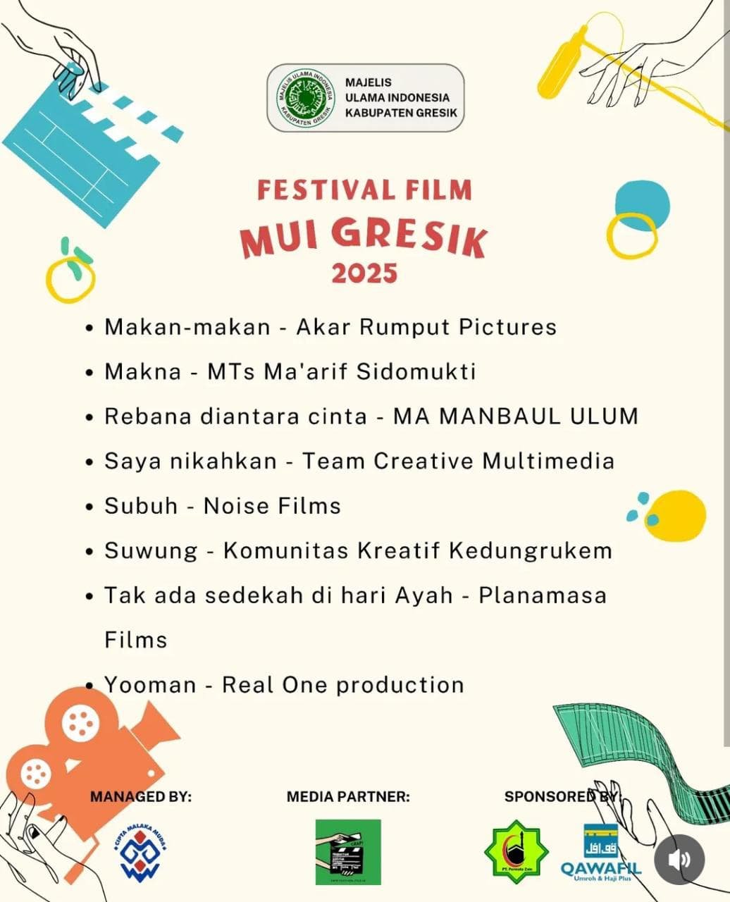 “Semoga dengan banyaknya peserta Festival Film Pendek MUI Gresik ini, menambah banyak warna dalam berdakwah, yang salah satunya bisa melalui karya seni seperti film pendek ini,” ujar H. Wahyani, di Kantor MUI Gresik, Rabu (19/11/2025).
