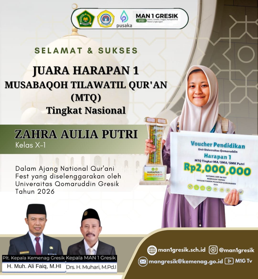 GRESIK, BN News – Prestasi membanggakan kembali ditorehkan oleh peserta didik terbaik dari MAN 1 Gresik. Zahra Aulia Putri, siswi kelas X-1, berhasil meraih Juara Harapan 1 Musabaqoh Tilawatil Qur’an (MTQ) Tingkat Nasional dalam ajang Qur’ani Fest yang diselenggarakan oleh Universitas Qomaruddin pada tahun 2026.